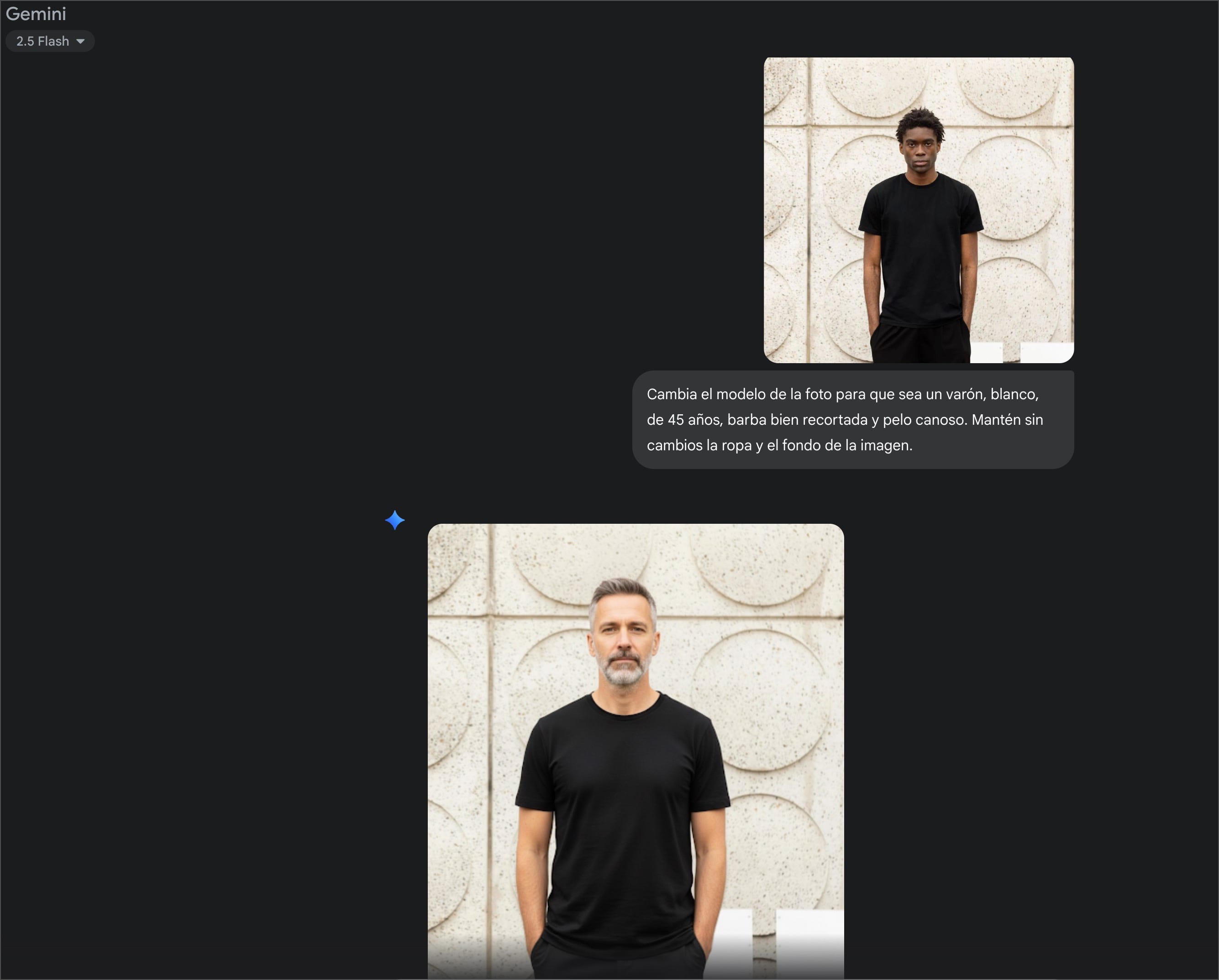 Now I go for another product. This time I want a model with more character, George Clooney type but silver fox edition. Since I haven't asked anyone's permission, I ask Banana to create a fictional model, elegant, mature, with that touch of sophistication the brand is looking for.